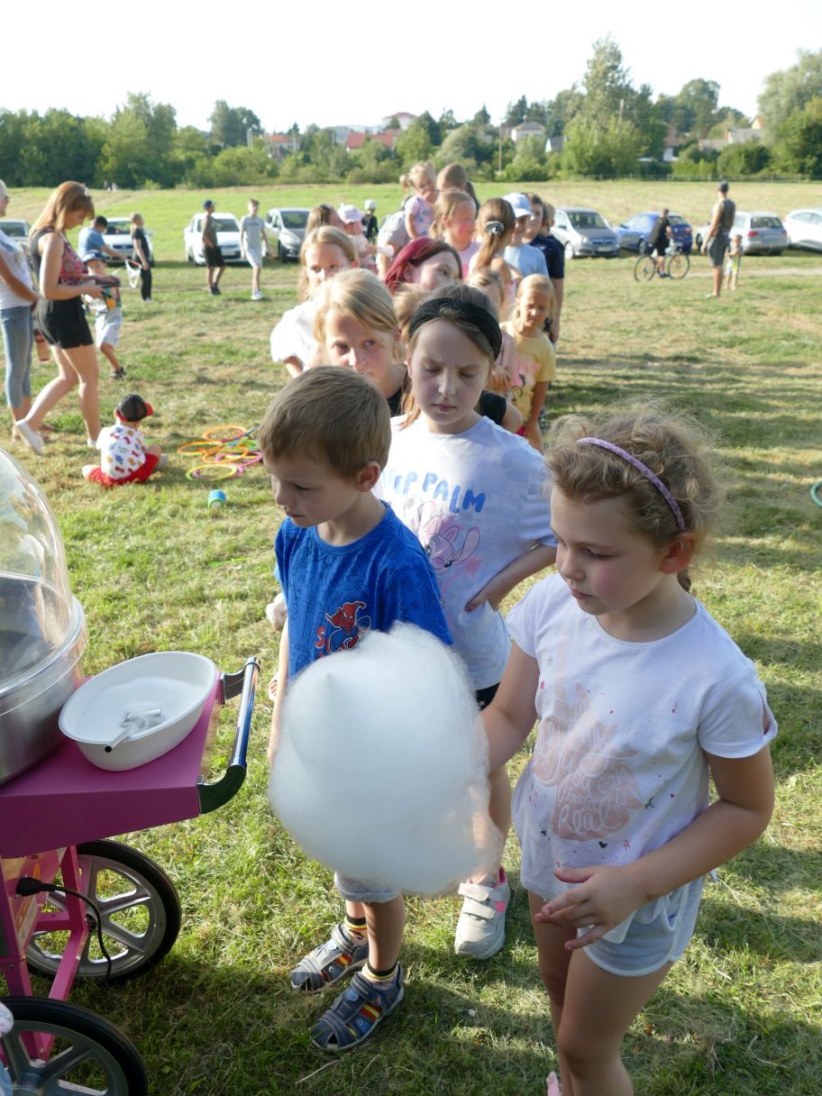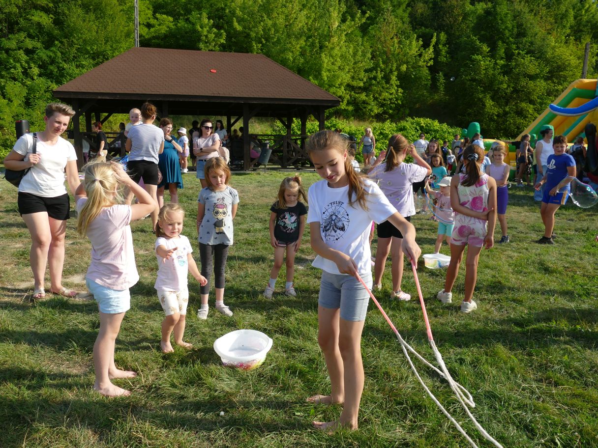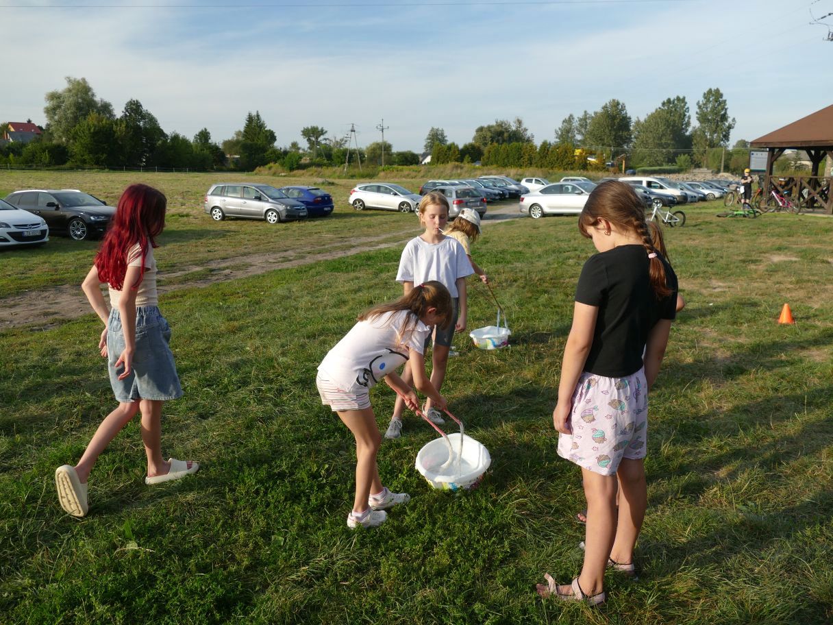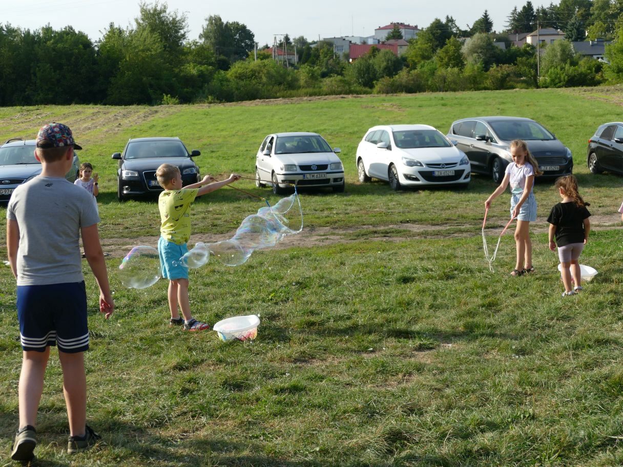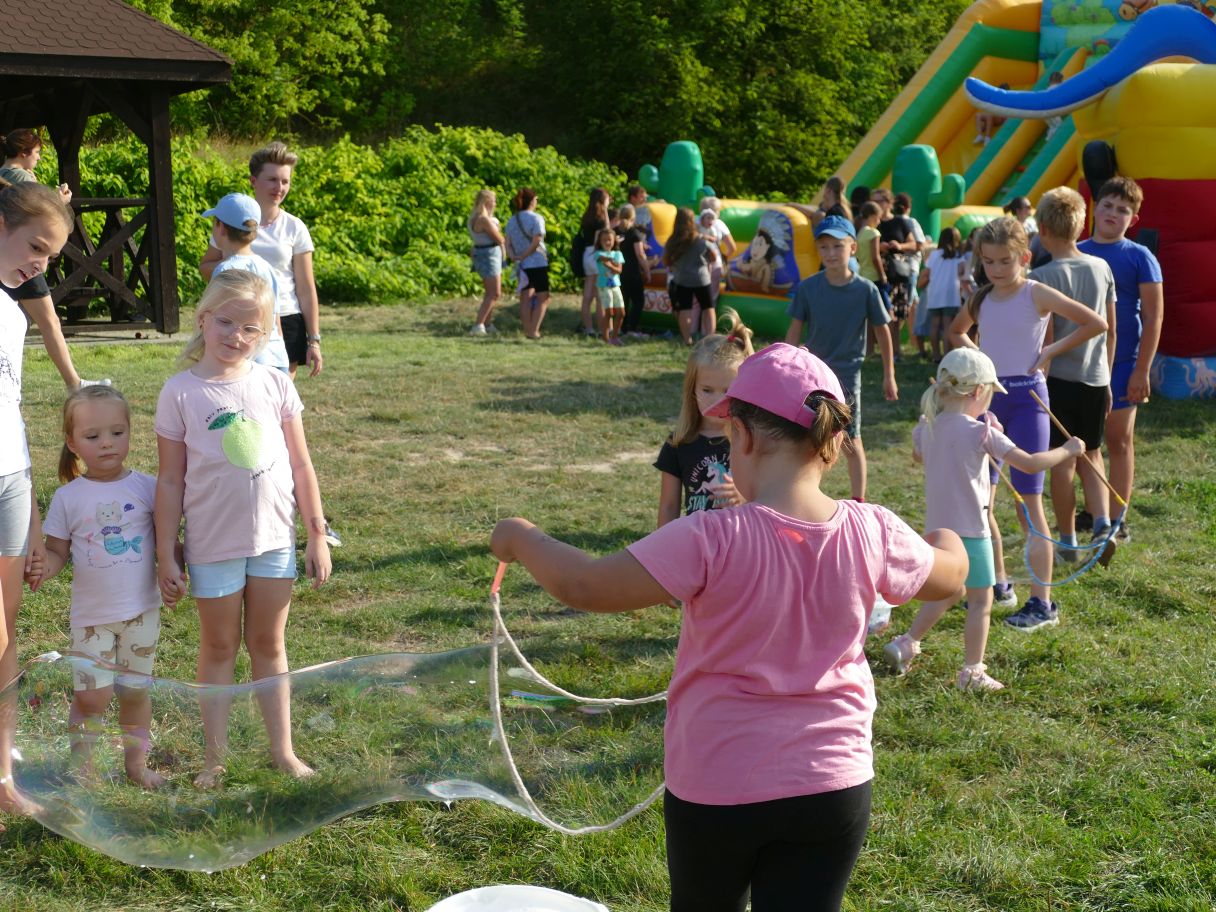 Młodsze dzieci pojawiły się z rodzicami, co dodatkowo zapewniło bezpieczną zabawę. Puszczaliśmy mega bańki mydlane, było skakanie w workach i mnóstwo innych atrakcji. Pożegnaliśmy czas odpoczynku i beztroski, za kilka dni powrócą szkolne obowiązki.