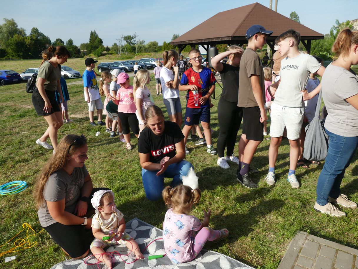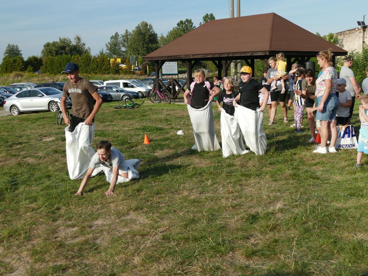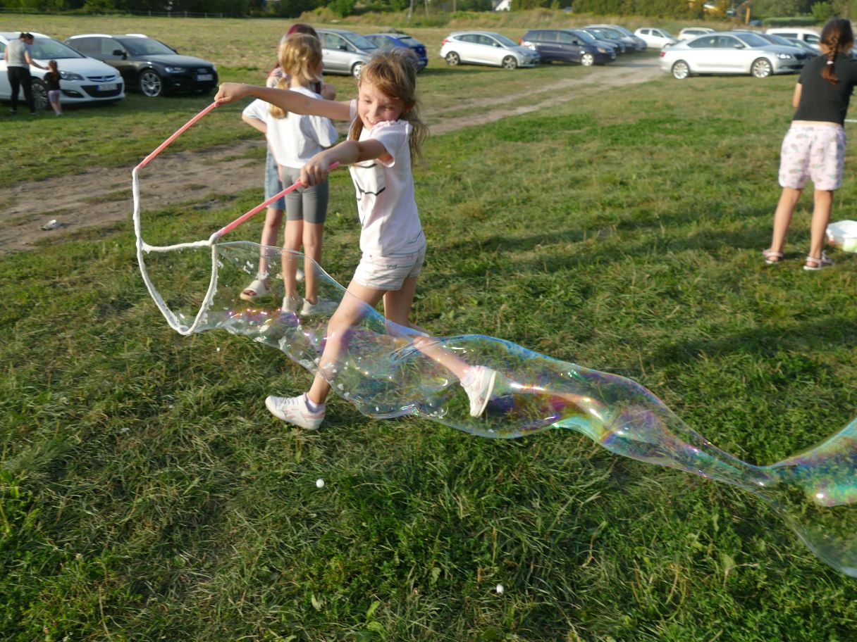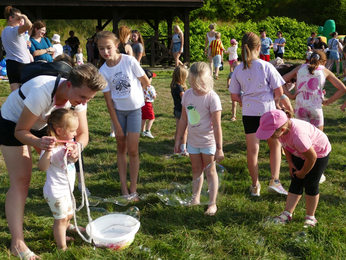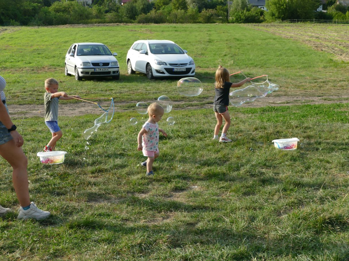 Młodsze dzieci pojawiły się z rodzicami, co dodatkowo zapewniło bezpieczną zabawę. Puszczaliśmy mega bańki mydlane, było skakanie w workach i mnóstwo innych atrakcji. Pożegnaliśmy czas odpoczynku i beztroski, za kilka dni powrócą szkolne obowiązki.