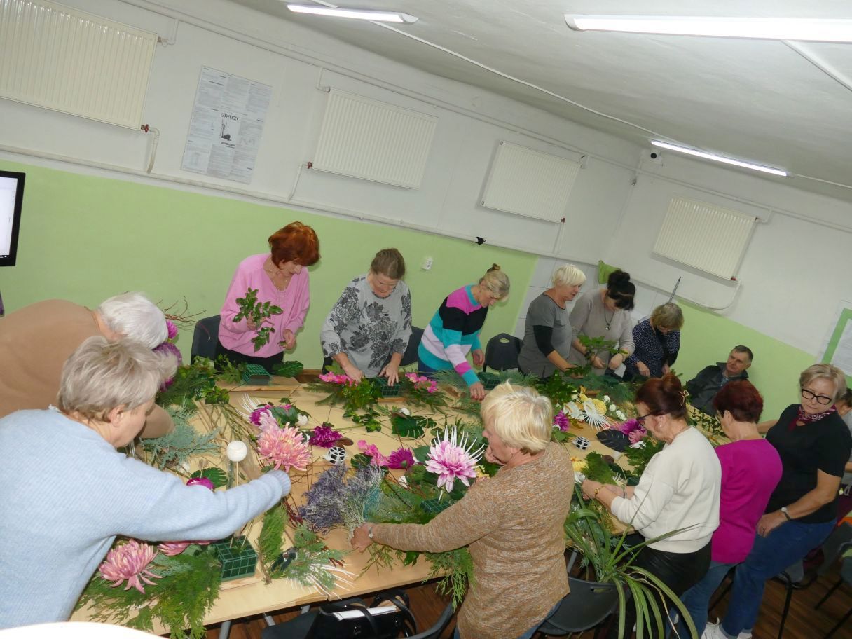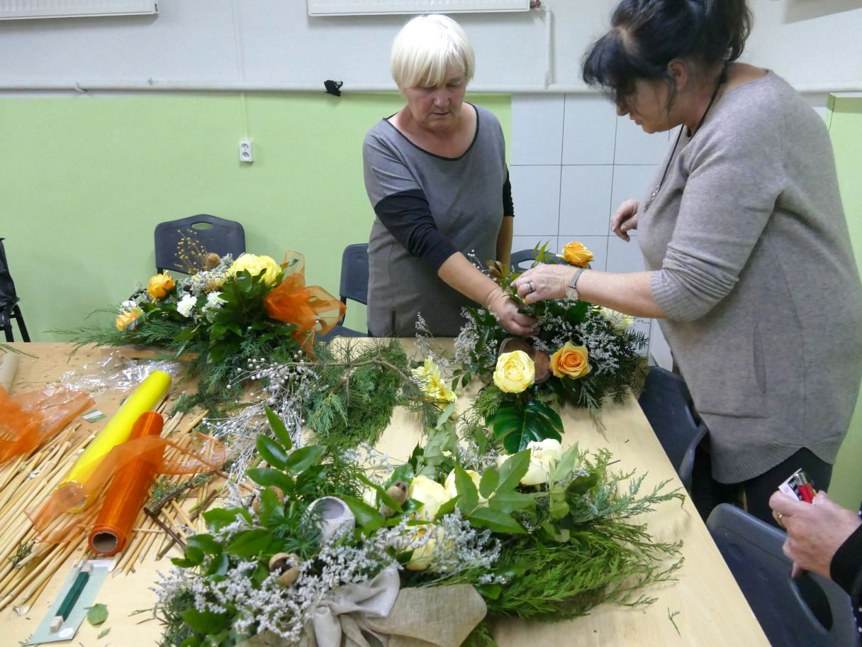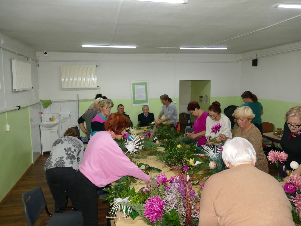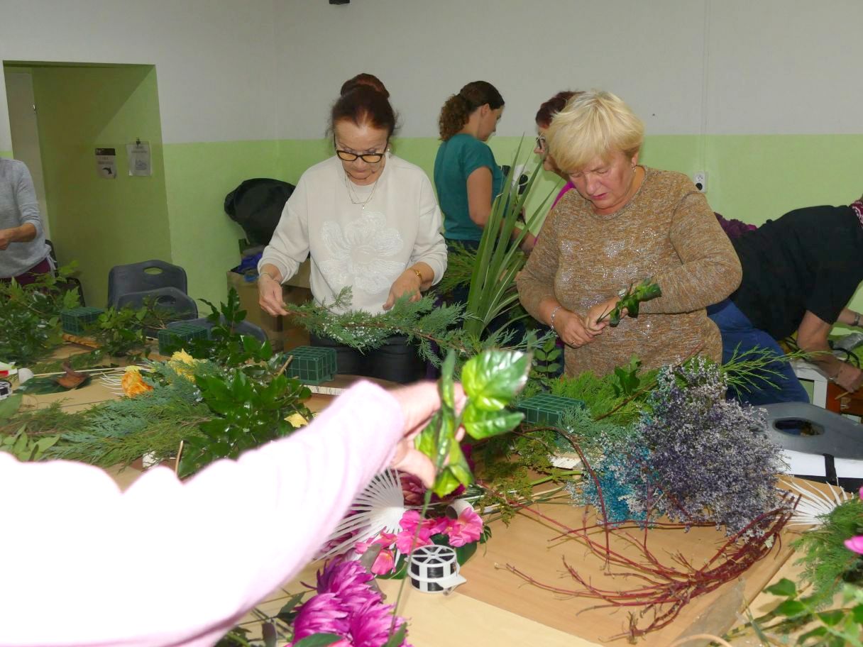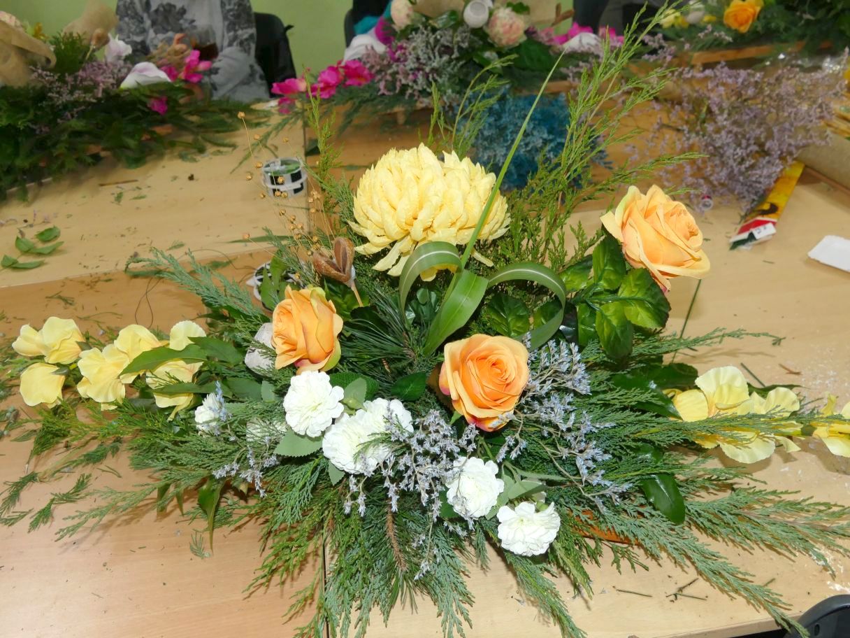 Gminny Ośrodek Kultury w Grabowcu, zorganizował pachnące świerkiem warsztaty, podczas których powstały oryginalne ozdoby na groby naszych bliskich. Zamysłem artystycznym było wykorzystanie naturalnego materiału roślinnego, czy to w formie zielonych gałązek igliwia, cz też pod postacią suszu. Do naszych stroików użyliśmy 50 centymetrowej deseczki, do której zamocowaliśmy floret z gąbką do układania żywego materiału florystycznego. Nie zabrakło także sztucznych, jesiennych kwiatów podkreślających tematykę stroików. Uczestnicy otrzymali wskazówki dotyczące rodzajów kompozycji, doboru i znaczenia barw, jak również pomoc w pracy twórczej. Efekty naszych działań prezentujemy poniżej...