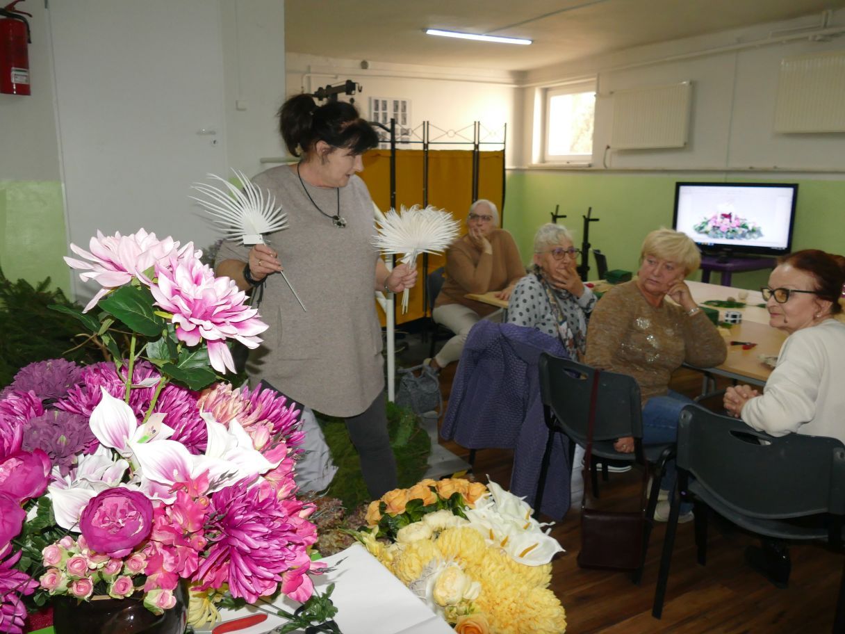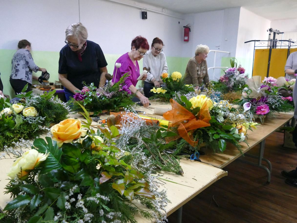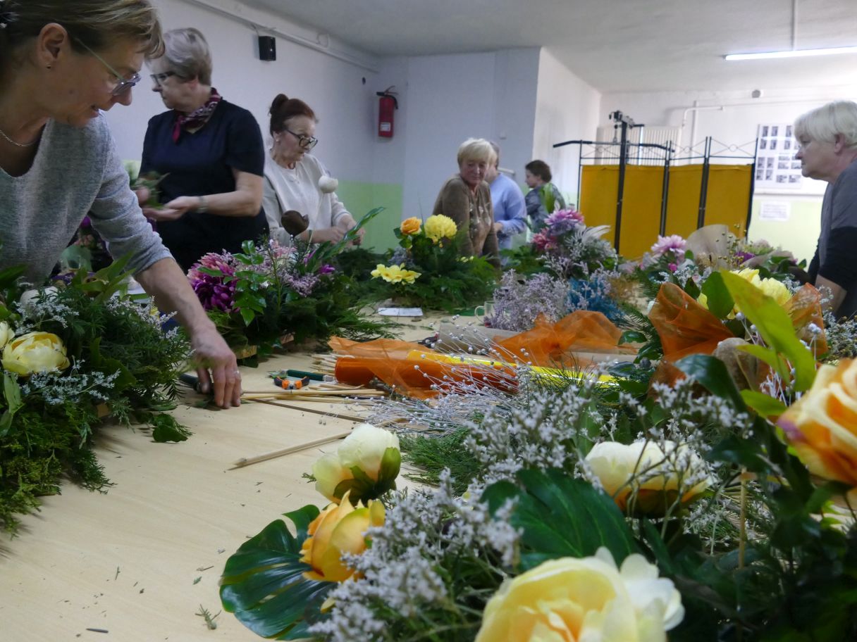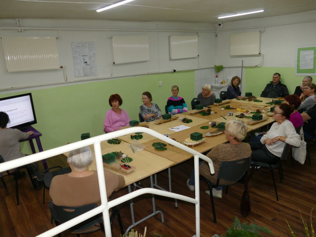 Gminny Ośrodek Kultury w Grabowcu, zorganizował pachnące świerkiem warsztaty, podczas których powstały oryginalne ozdoby na groby naszych bliskich. Zamysłem artystycznym było wykorzystanie naturalnego materiału roślinnego, czy to w formie zielonych gałązek igliwia, cz też pod postacią suszu. Do naszych stroików użyliśmy 50 centymetrowej deseczki, do której zamocowaliśmy floret z gąbką do układania żywego materiału florystycznego. Nie zabrakło także sztucznych, jesiennych kwiatów podkreślających tematykę stroików. Uczestnicy otrzymali wskazówki dotyczące rodzajów kompozycji, doboru i znaczenia barw, jak również pomoc w pracy twórczej. Efekty naszych działań prezentujemy poniżej...