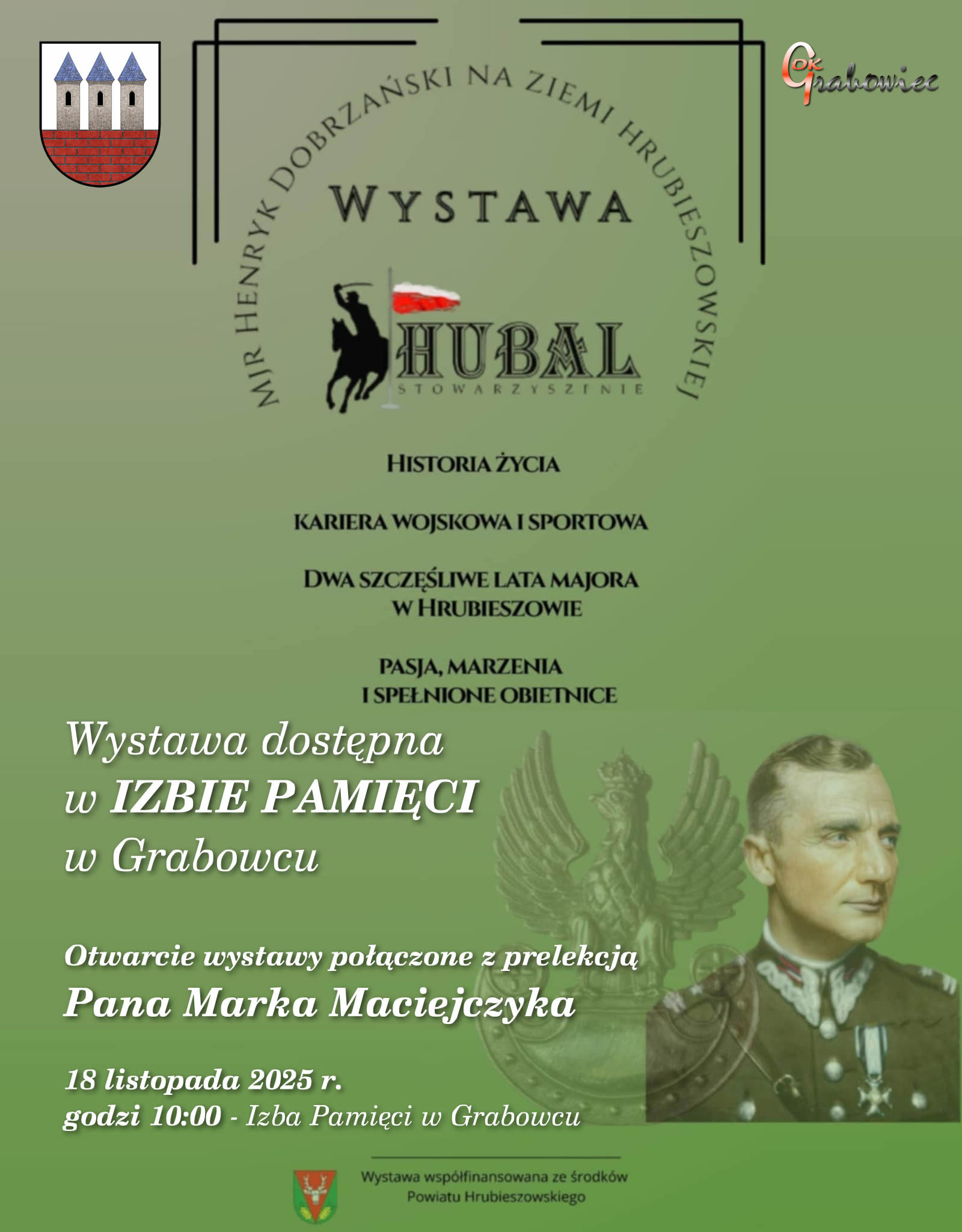 Zapraszamy na wystawę pt. „Mjr Henryk Dobrzański na ziemi hrubieszowskiej”, poświęconą legendarnemu żołnierzowi i bohaterowi, znanemu jako „Hubal”. Wystawa dostępna jest w godzinach pracy Izby Pamięci od 16 listopada 2025 roku.